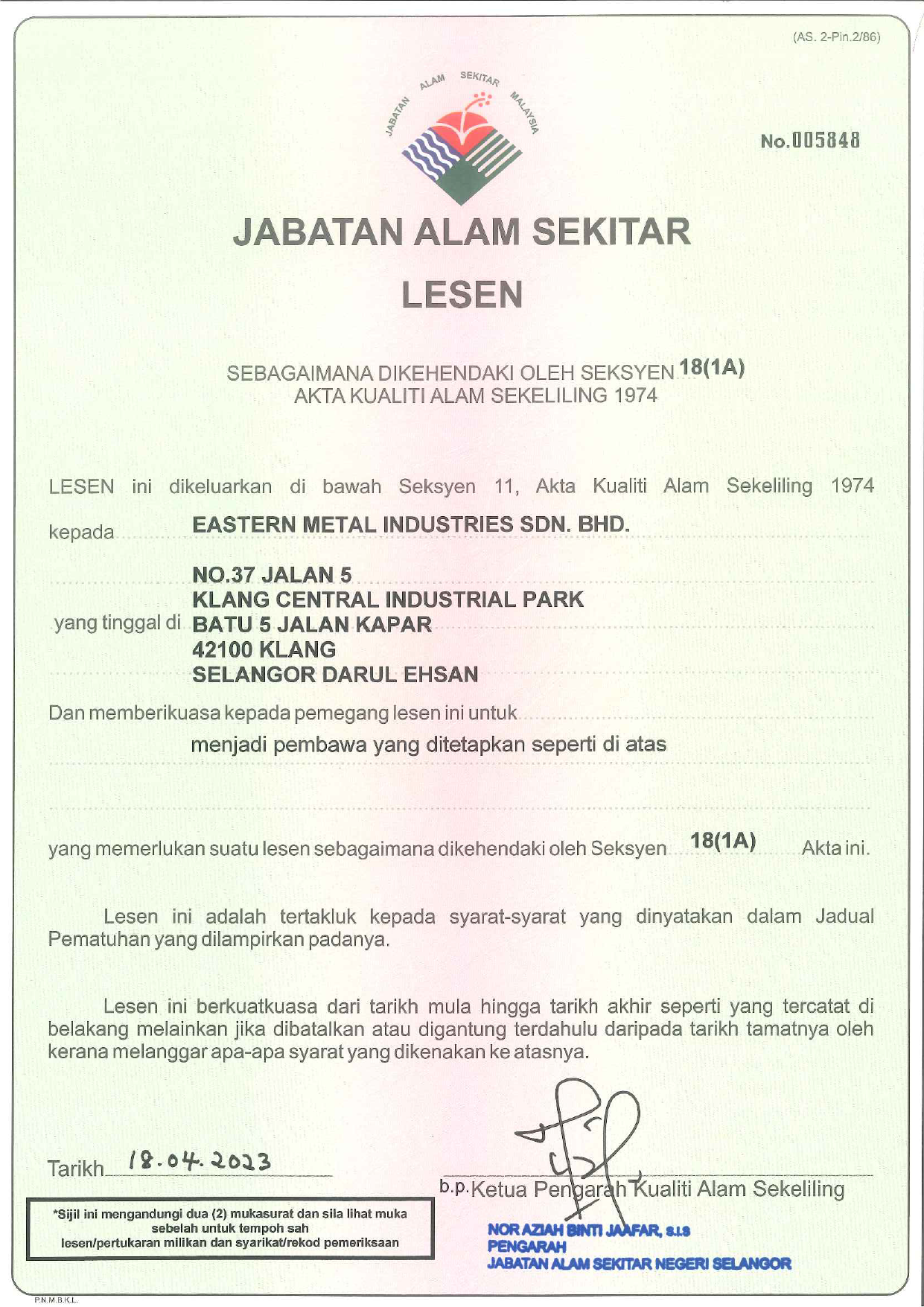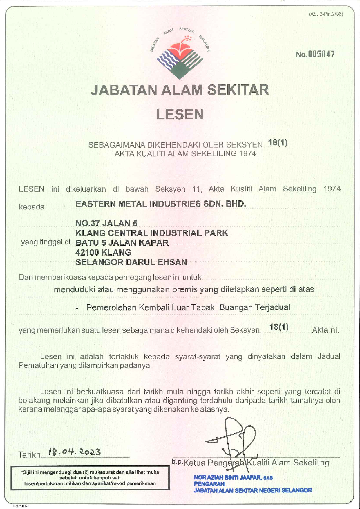 EASTERN METAL INDUSTRIES SDN. BHD. is also an Aluminium Dross (SW 104) recycling plant licensed under Department of Environment Selangor. It is also specialized in tolling of aluminium scraps such as chips, sport rims, tense and other aluminium materials.