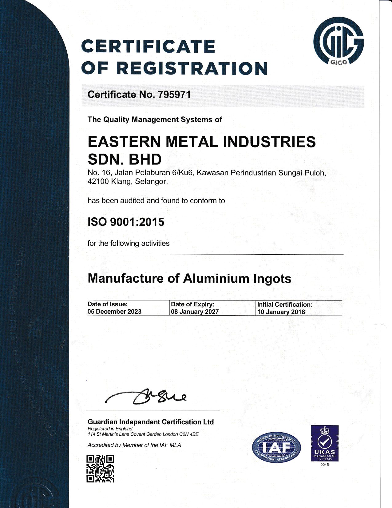 EASTERN METAL INDUSTRIES SDN. BHID is a registered and established Aluminium Scraps Recycling Empany incorporated in 2006. Eastern Metal Industries Sdn Bhd is also a global Non-ferrous metal trading company handling all Non-Ferrous scraps. Eastern Metal Industries Sdn Bhd supplies its Aluminium Alloy Ingot globally to countries like Japan, Hong Kong, Korea, Taiwan, Indonesia and others. It manufactures Aluminium Alloy Ingots which complies to international standards such as JIS(Japan), IM(UK), AA(US), DIN(German) and even customized specification aluminium alloy as per customer’s requirement.